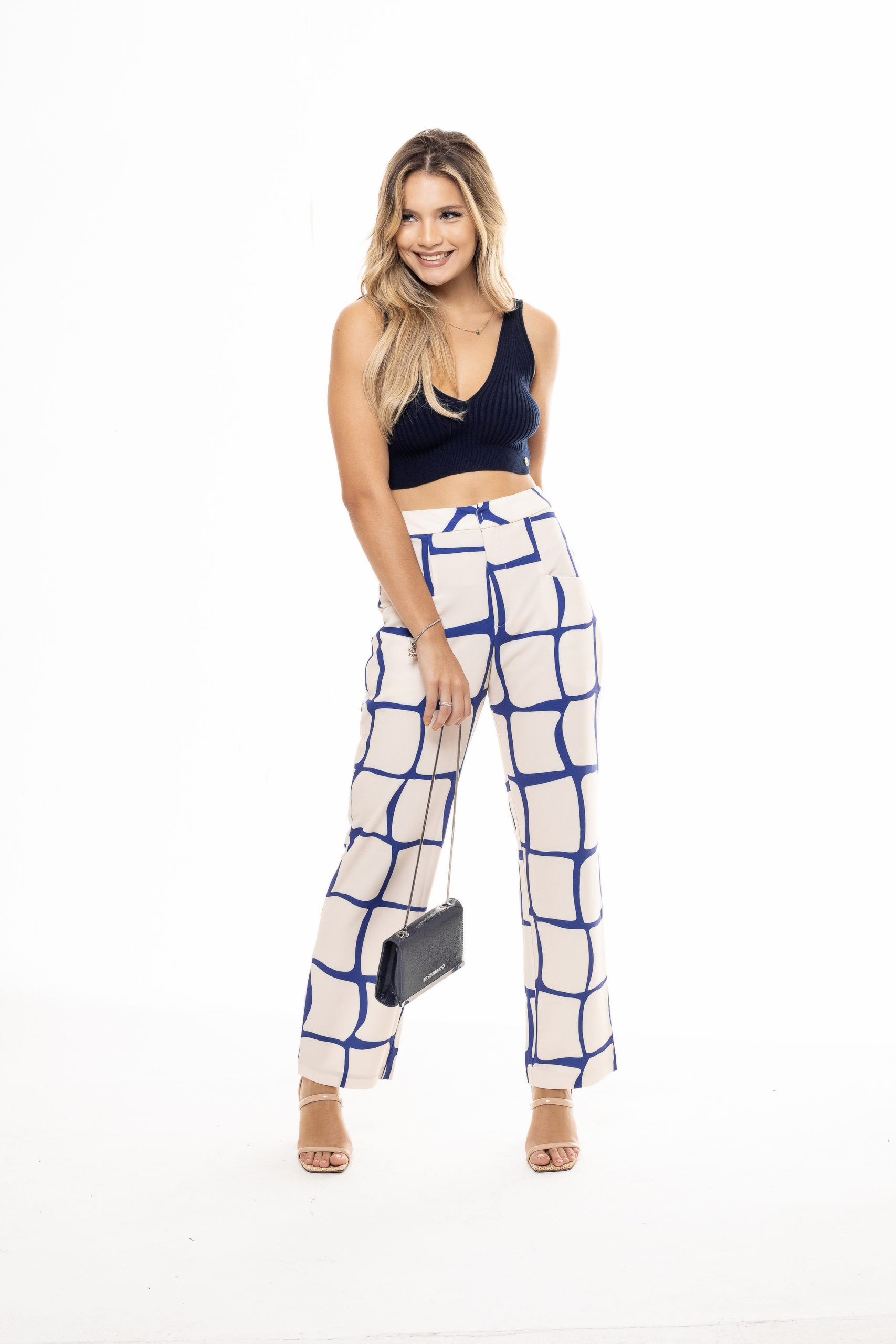 Calça Alfaiataria Cós Alto Estampa Abstrata Azul
