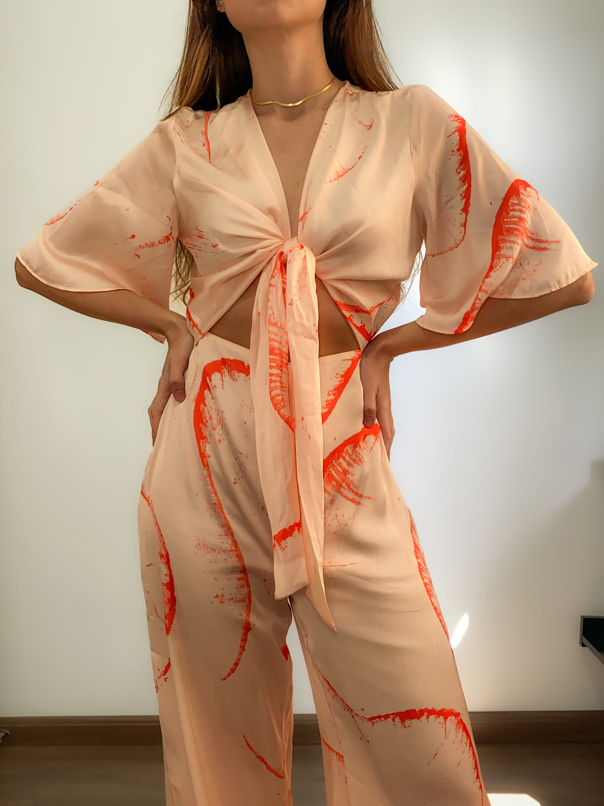 Confeccionado em tecido plano leve de seda com estampa abstrata, este macacão alia elegância e conforto em uma peça única. A modelagem é justa na parte superior e ampla no comprimento, trazendo movimento e sofisticação. O modelo conta com mangas 3/4, decote em V com amarração frontal e fechamento traseiro por zíper invisível. Possui forro interno e barra com acabamento simples.