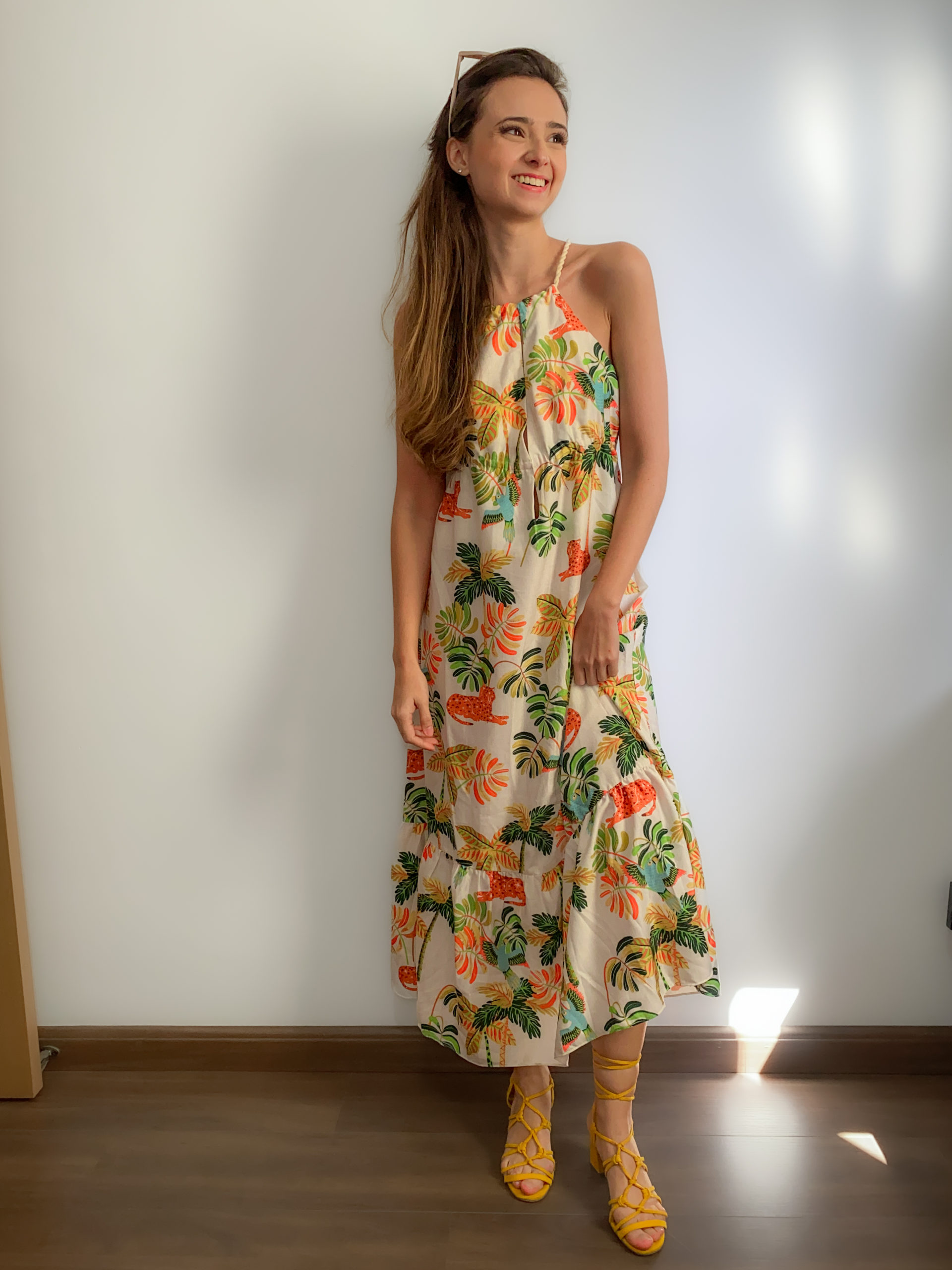 Vestido Midi com Decote em V Cortininha Estampa Exclusiva Zinco